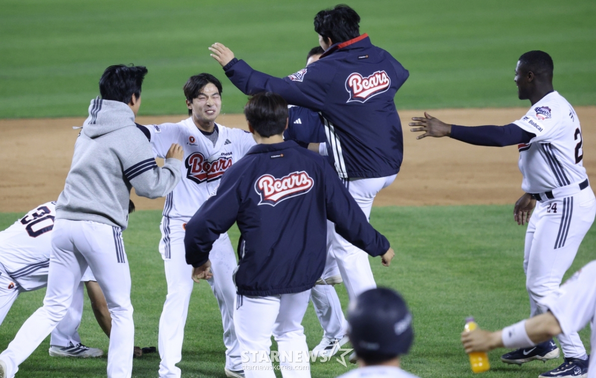 Doosan's Lee Yu-chan hit a walk-off double in the bottom of the 10th extra inning with one out and runners on first and second, celebrating with his teammates.
