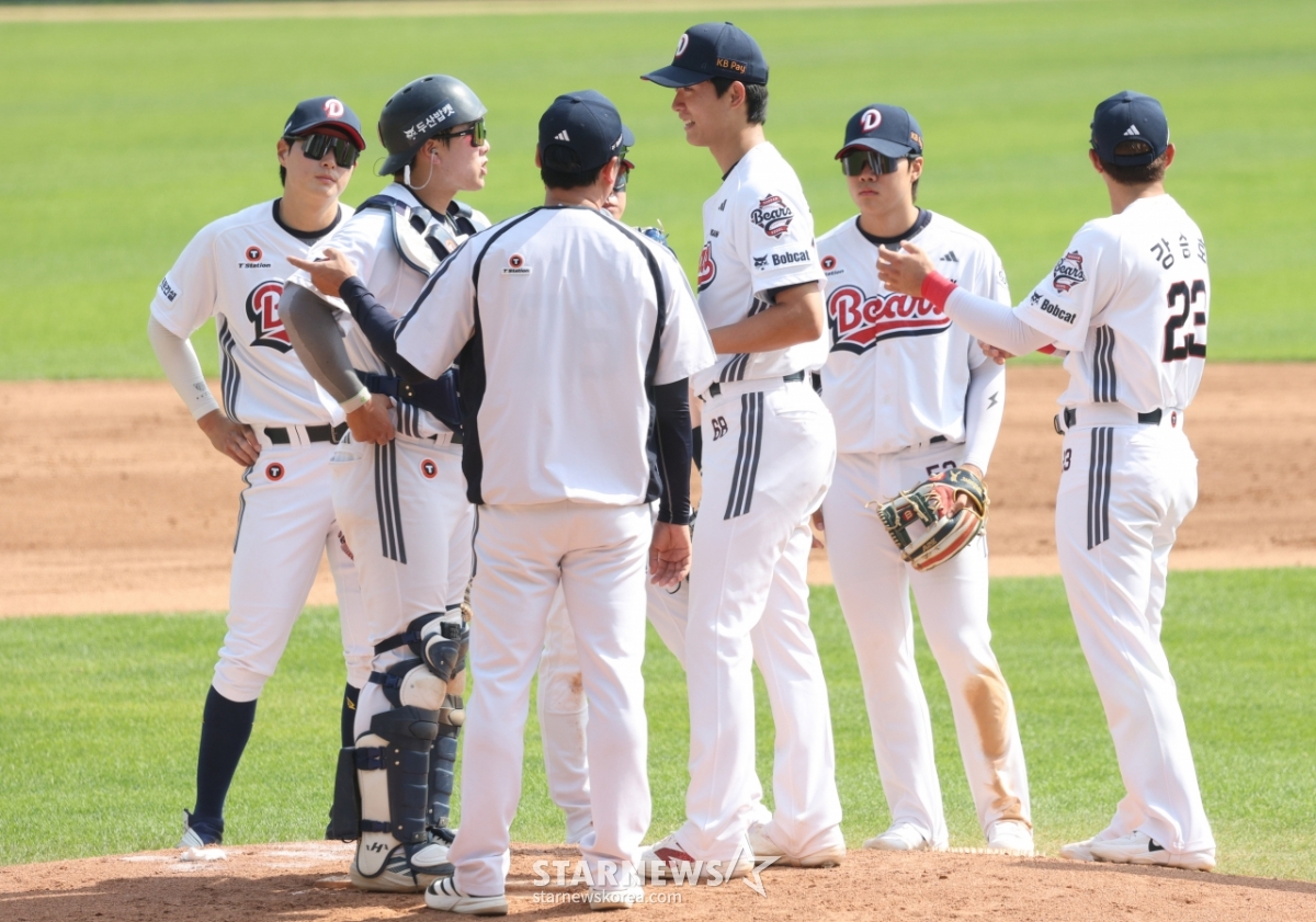 Doosan starter Choi Min-seok gave up a run in the bottom of the 4th inning, causing him to waver, as the pitching coach climbed onto the mound to calm him down.