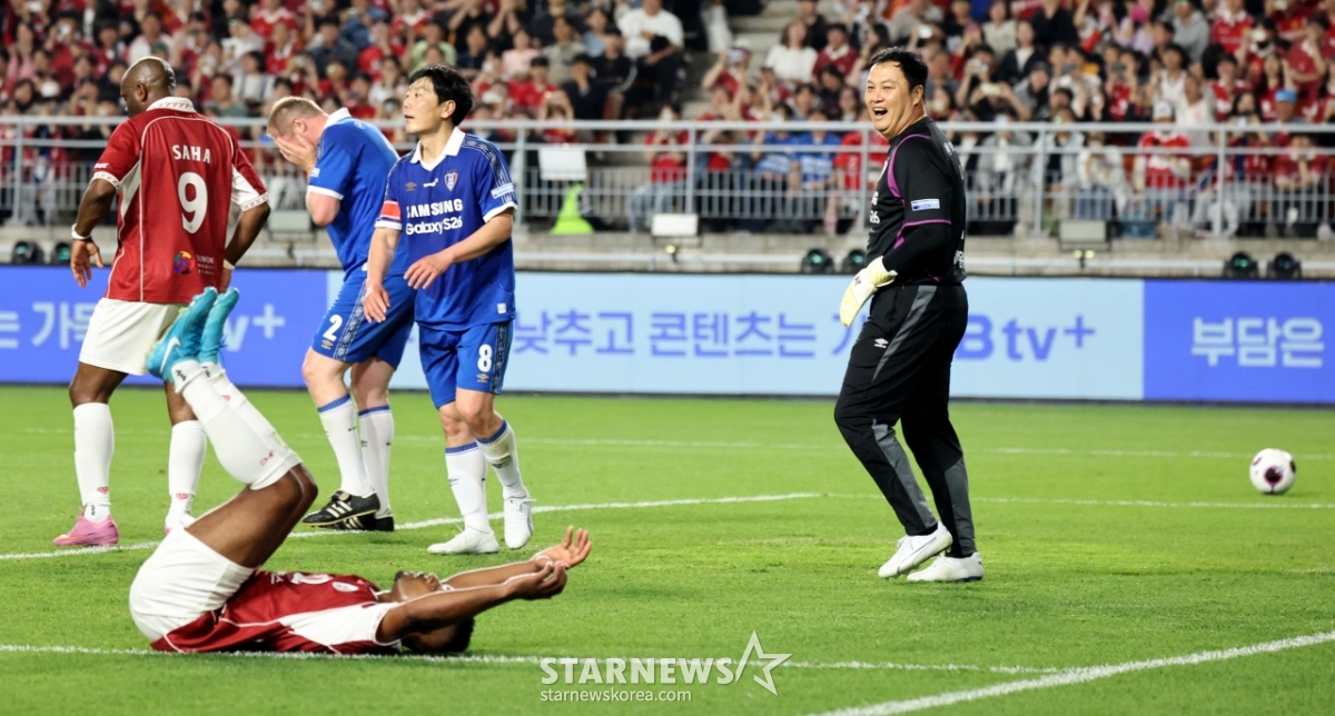 OGFC's Ebraa is seen missing a shot while being marked by Lee Woon-jae during the second half of the OGFC vs. Suwon Samsung Legend Match held at Suwon World Cup Stadium on the 19th. The shot also failed, and an offside call was made. 2026.04.19.