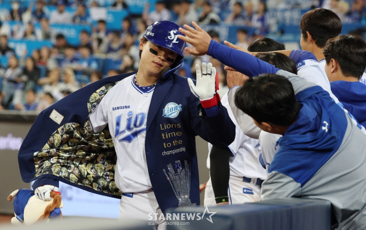 Samsung's Park Seung-gyu hit a go-ahead, one-run home run to left field in the bottom of the third inning with no outs and is rounding the bases.