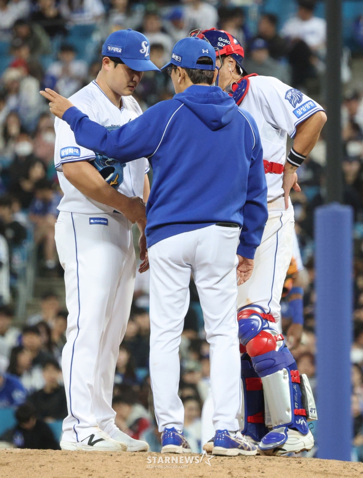 As Samsung starter Choi Won-tae showed signs of being shaken, the pitching coach climbed onto the mound to calm him down.