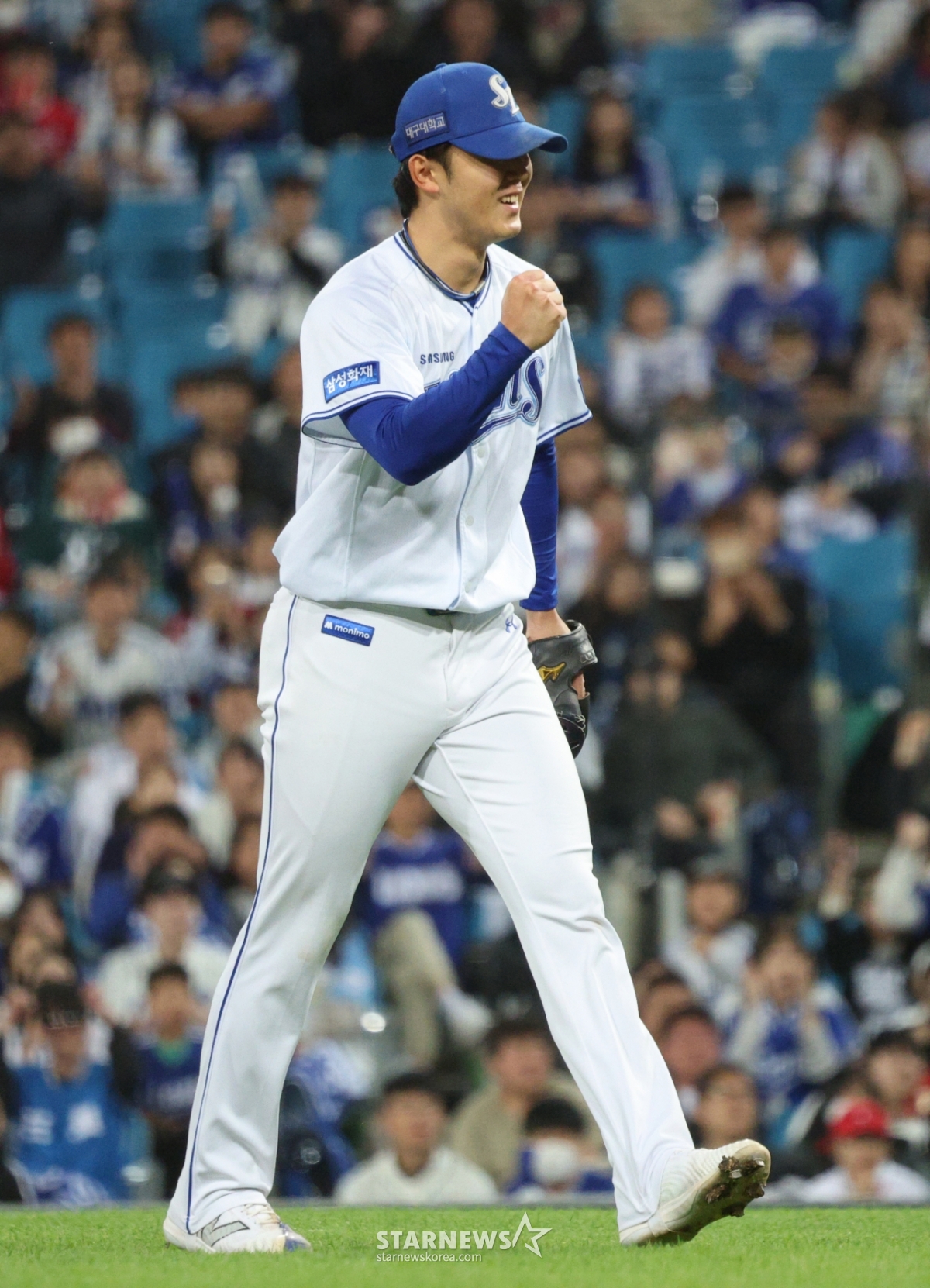 Samsung's Miyaji is cheering after striking out SSG's Kim Jae-hwan with two outs in the top of the 9th inning with runners on first and second.