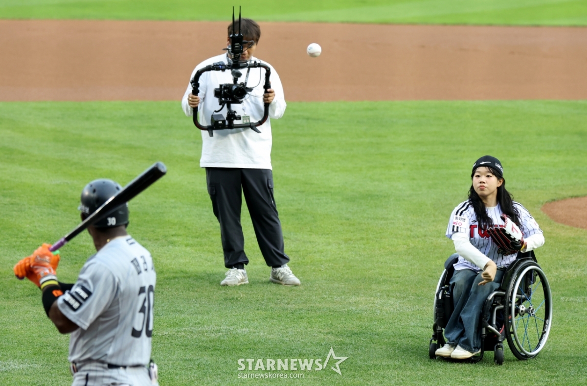 Kim Yoon-ji, a gold medalist in Nordic skiing at the Winter Paralympics and the recipient of the most medals (five) in a single competition, threw the ceremonial first pitch at the 2026 KBO League LG Twins vs. Hanwha Eagles game held at Jamsil Baseball Stadium on the 23rd. 2026.04.23.
