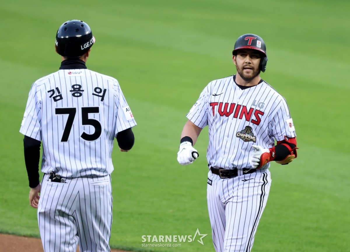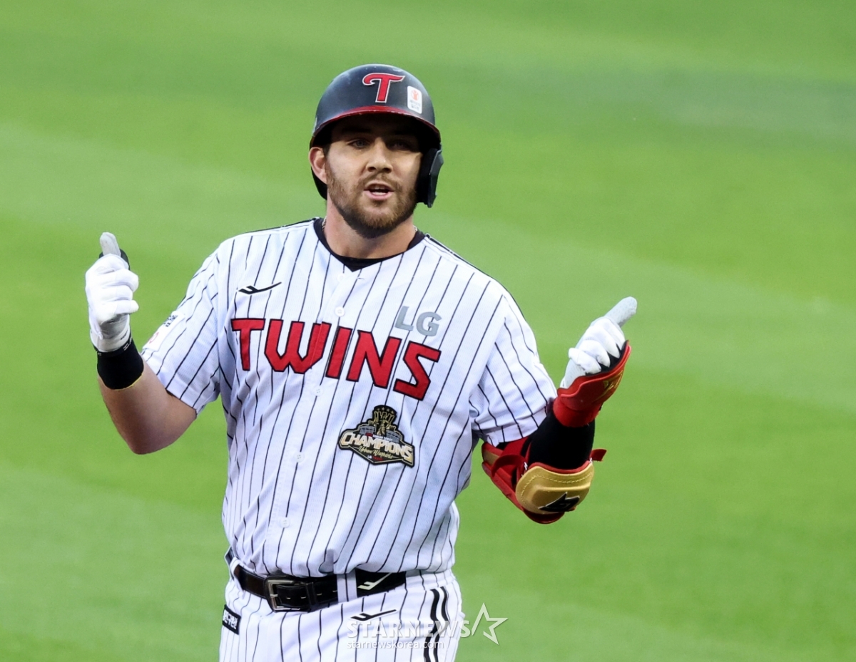 LG's third batter, Austin, celebrates after hitting a sacrifice fly with no outs and a runner on third base in the bottom of the first inning of the 2026 KBO League game between LG Twins and Hanwha Eagles at Jamsil Baseball Stadium on the 23rd. 2026.04.23.