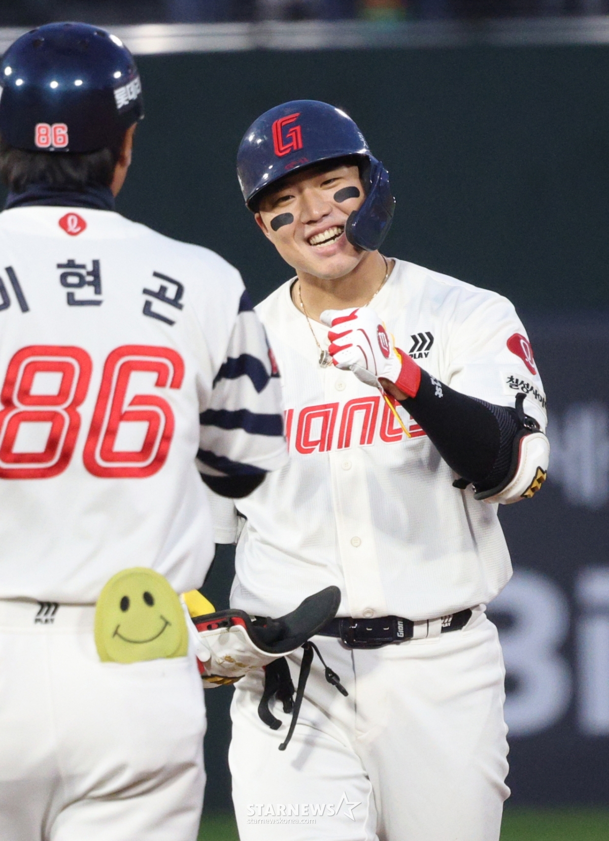 Lotte's Son Seong-bin hit a two-run double to tie the score with two outs and a runner on first base in the bottom of the second inning, then received a welcome from coach Lee Hyun-geon.