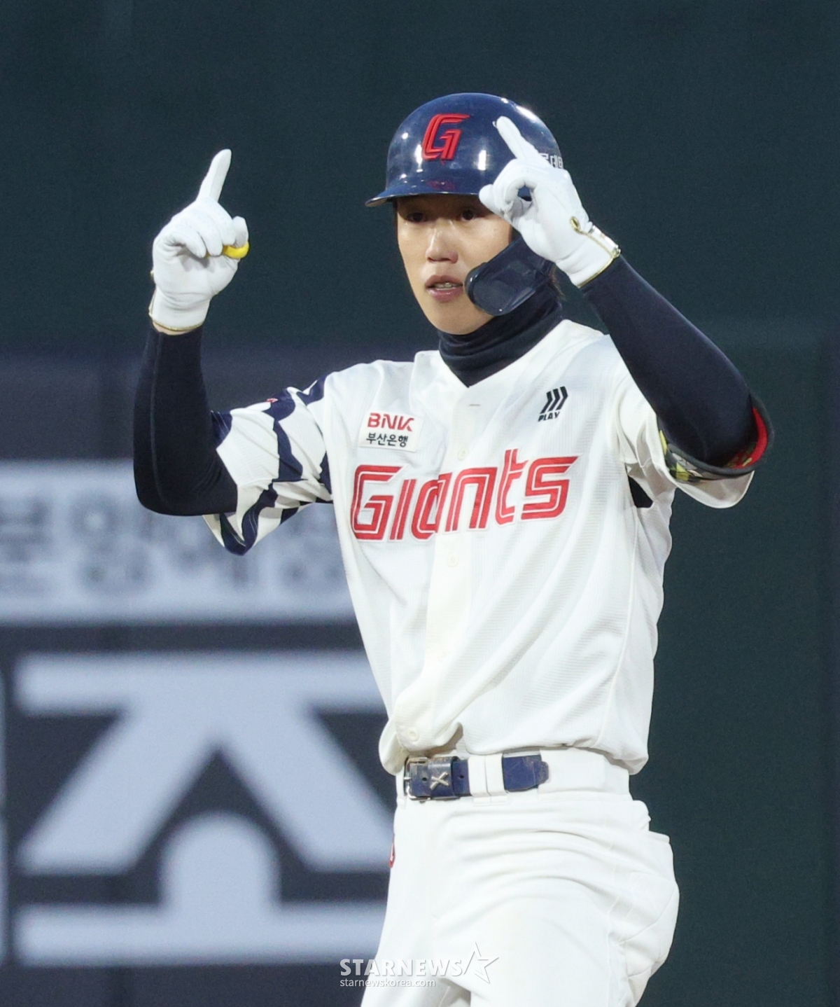 Lotte's Jeon Min-jae hit a go-ahead, two-run double with two outs in the bottom of the second inning, reached base, and performed a celebration.