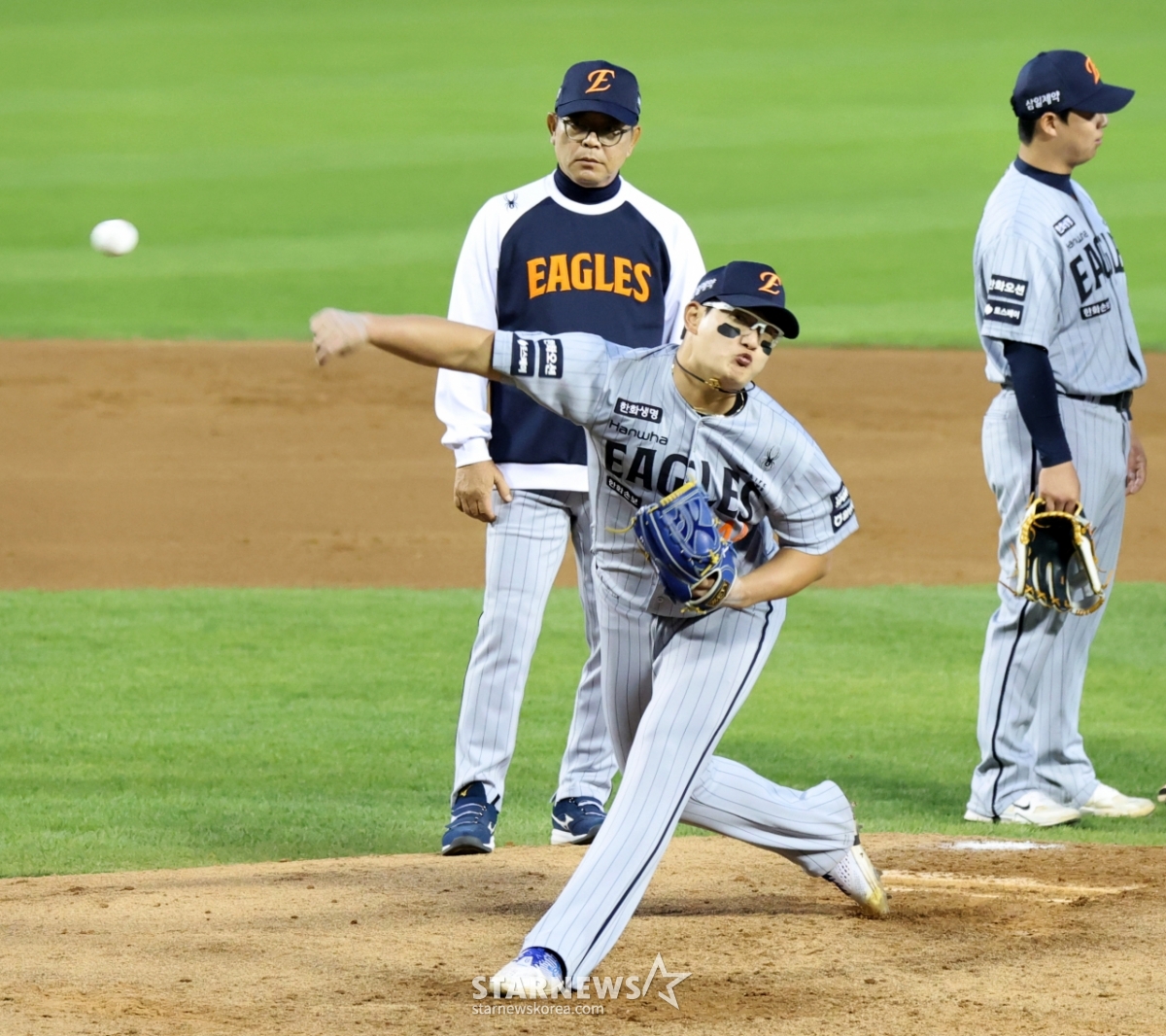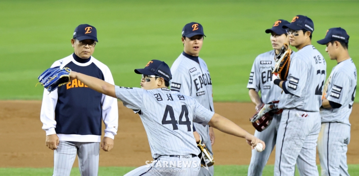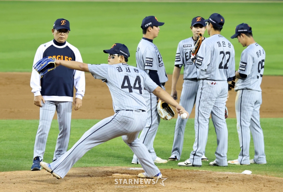 Hanwha relief pitcher Kim Seo-hyun took the mound in the bottom of the 3rd inning with two outs and a runner on first base, replacing Hwang Jun-seo, during the 2026 KBO League match between LG Twins and Hanwha Eagles held at Jamsil Baseball Stadium on the 23rd, as coach Yang Sang-moon watched. April 23, 2026.