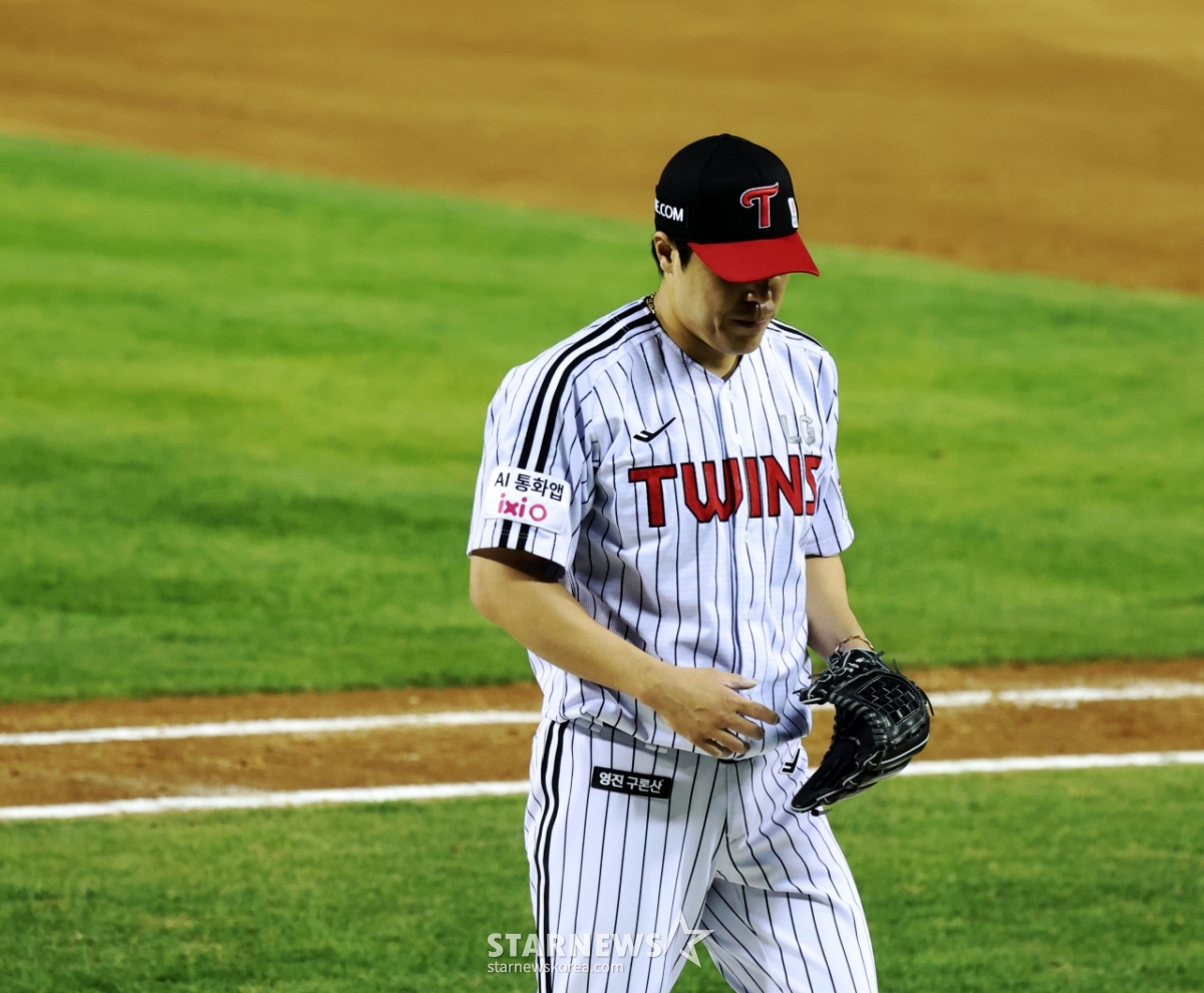LG right-handed relief pitcher Kim Jin-seong is being substituted in the bottom of the 5th inning of the 2026 KBO League LG Twins vs. Hanwha Eagles game held at Jamsil Baseball Stadium on the 23rd. Hanwha is leading 4-2. 2026.04.23.