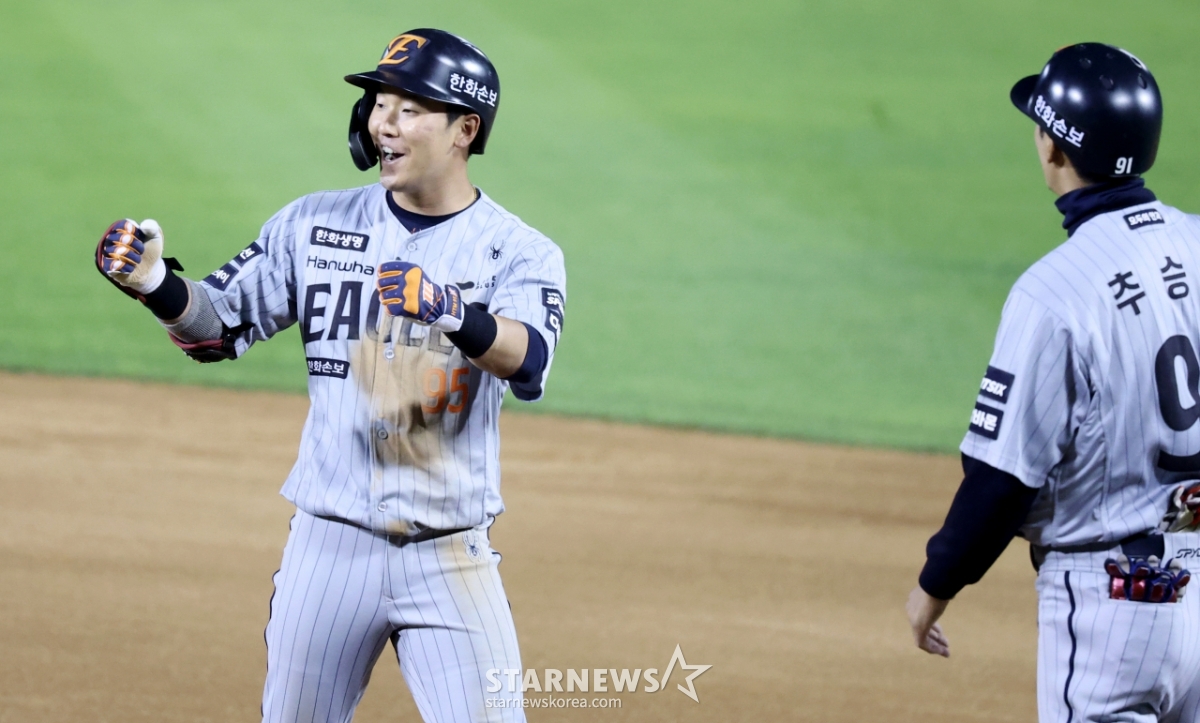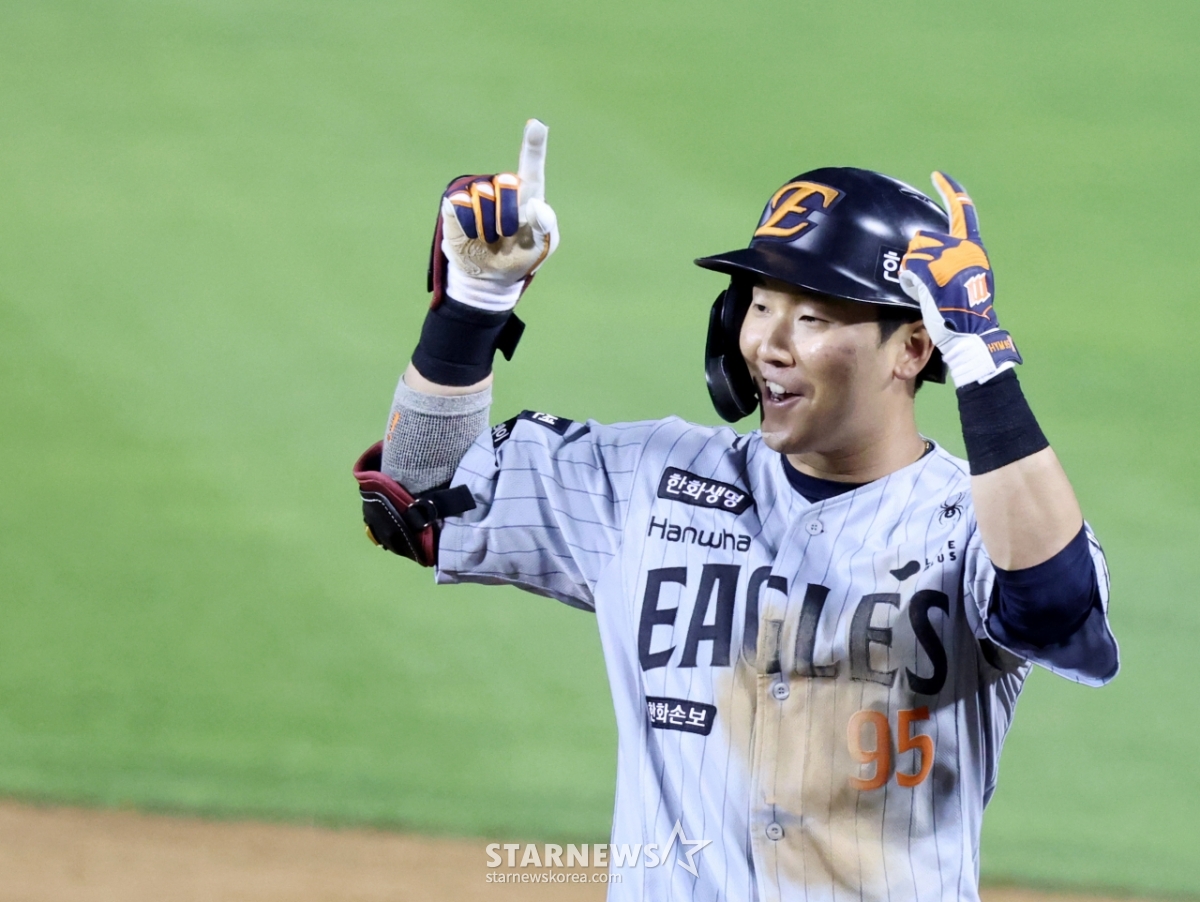 Hanwha's leadoff hitter Hwang Young-muk celebrates after hitting a two-run single to left field in the bottom of the 6th with two outs and runners on second and third during the 2026 KBO League game between LG Twins and Hanwha Eagles at Jamsil Baseball Stadium on the 23rd.