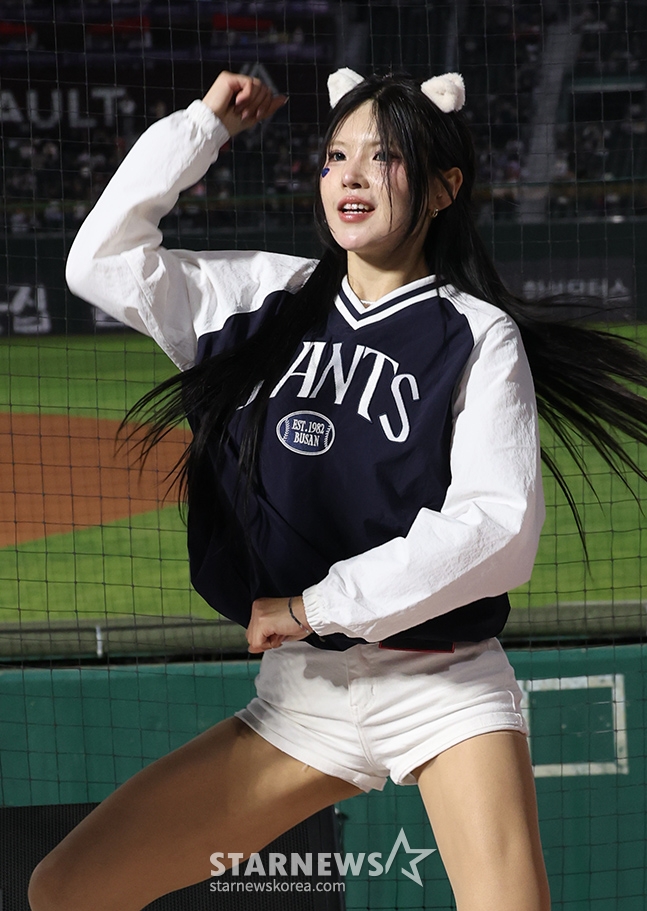 Lotte cheerleader Lee Jeong-won is offering a refreshing cheer.