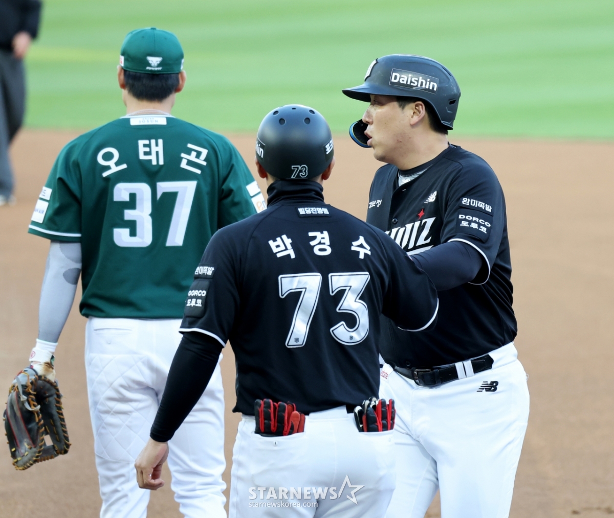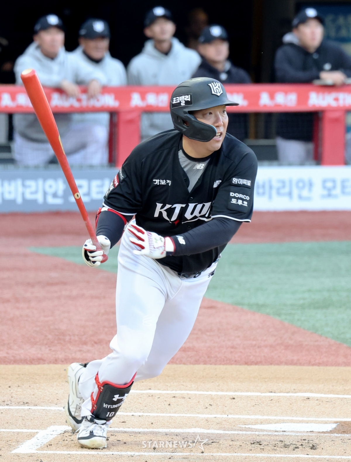 KT's third batter Kim Hyun-soo reached base with a hit in the top of the first inning during the 2026 KBO League match between SSG Landers and KT Wiz at Landers Field on the 24th. 2026.04.24.