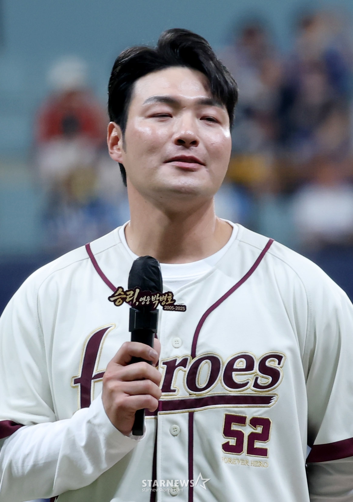 At the retirement ceremony held on the 26th at Gocheok Sky Dome, Park Byung-ho (40, Kiwoom Heroes reserve team coach), who was leaving the field he had grown fond of, finally showed tears in his eyes.