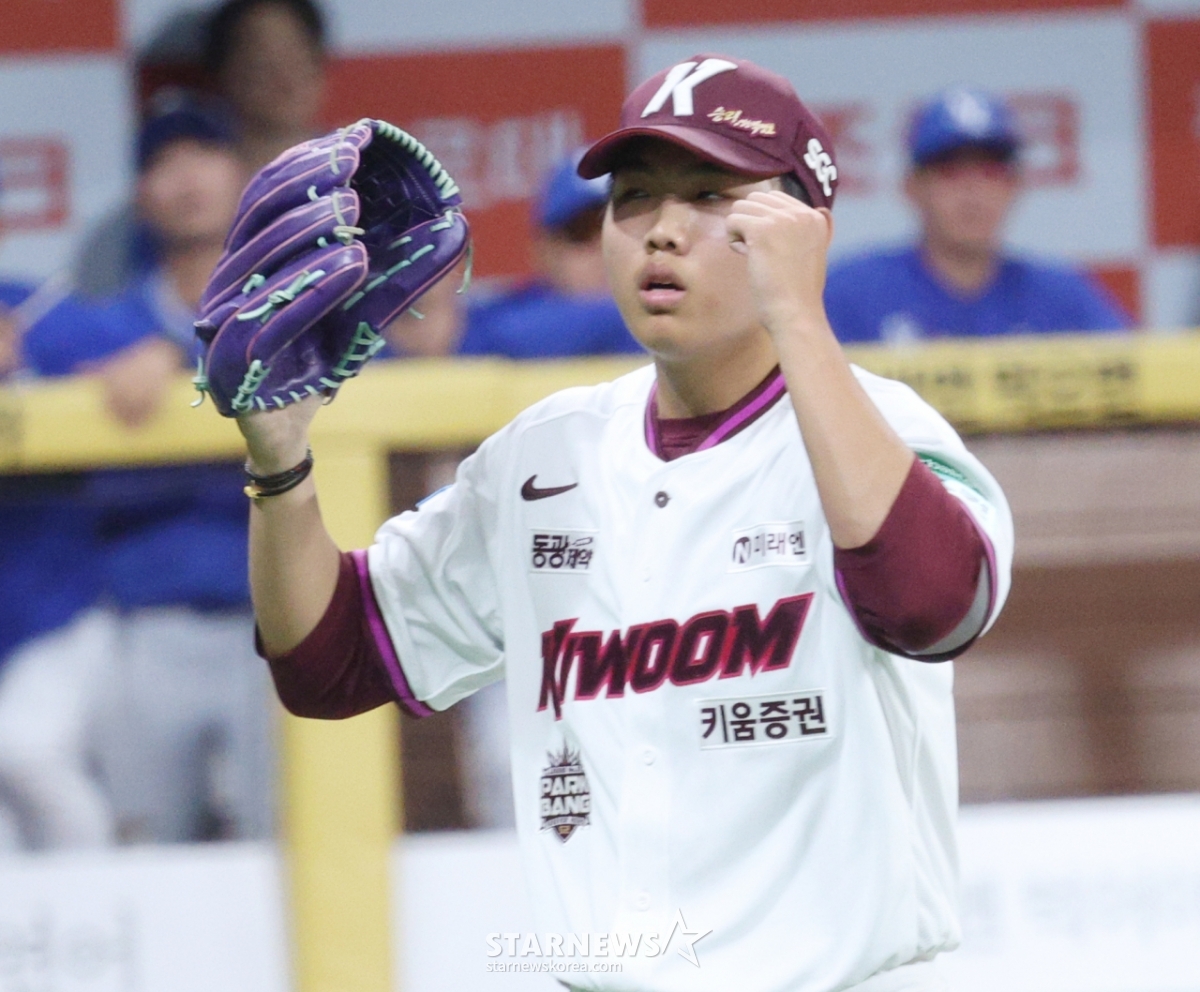 Kiwoom's Park Jeong-hoon is clapping his hands and heading to the dugout after finishing the inning by overcoming a scoring crisis in the bottom of the 8th.