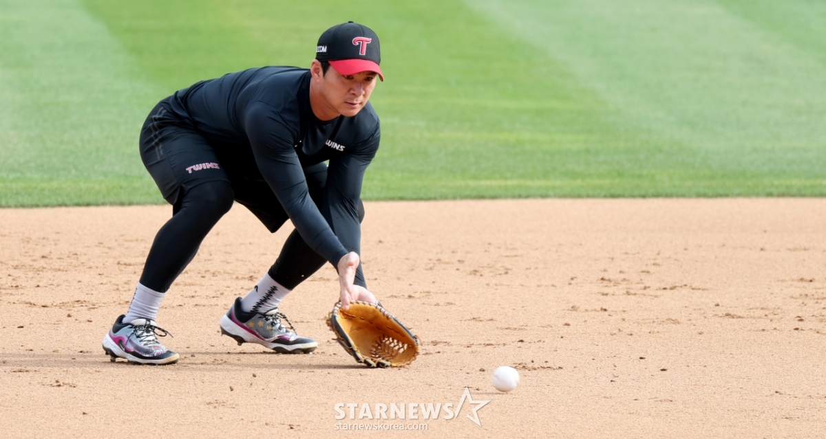 LG shortstop Oh Ji-hwan is seen conducting defensive training ahead of the 2026 KBO League match between LG Twins and KT Wiz held at Suwon KT Wiz Park on the 28th. 2026.04.28.