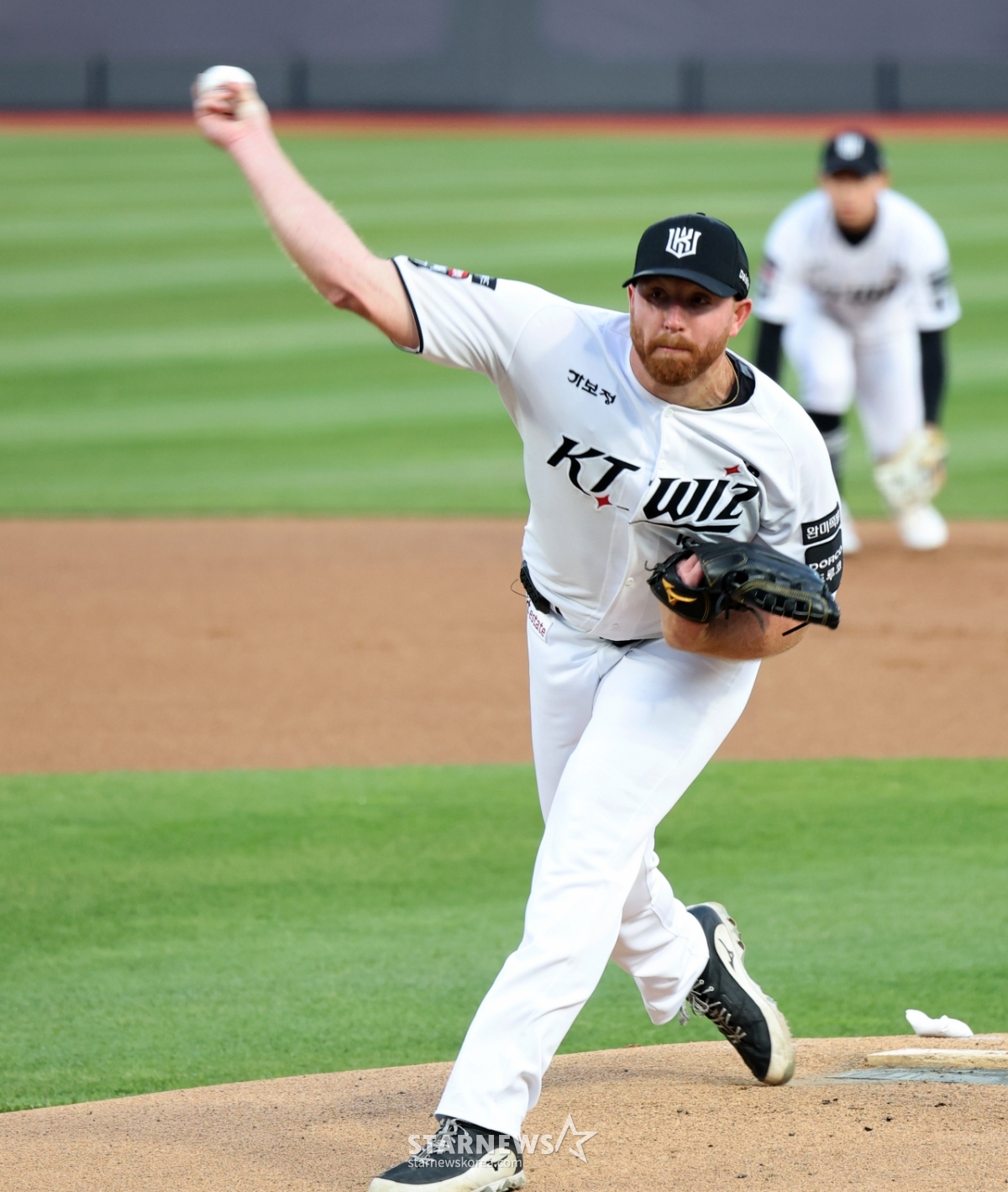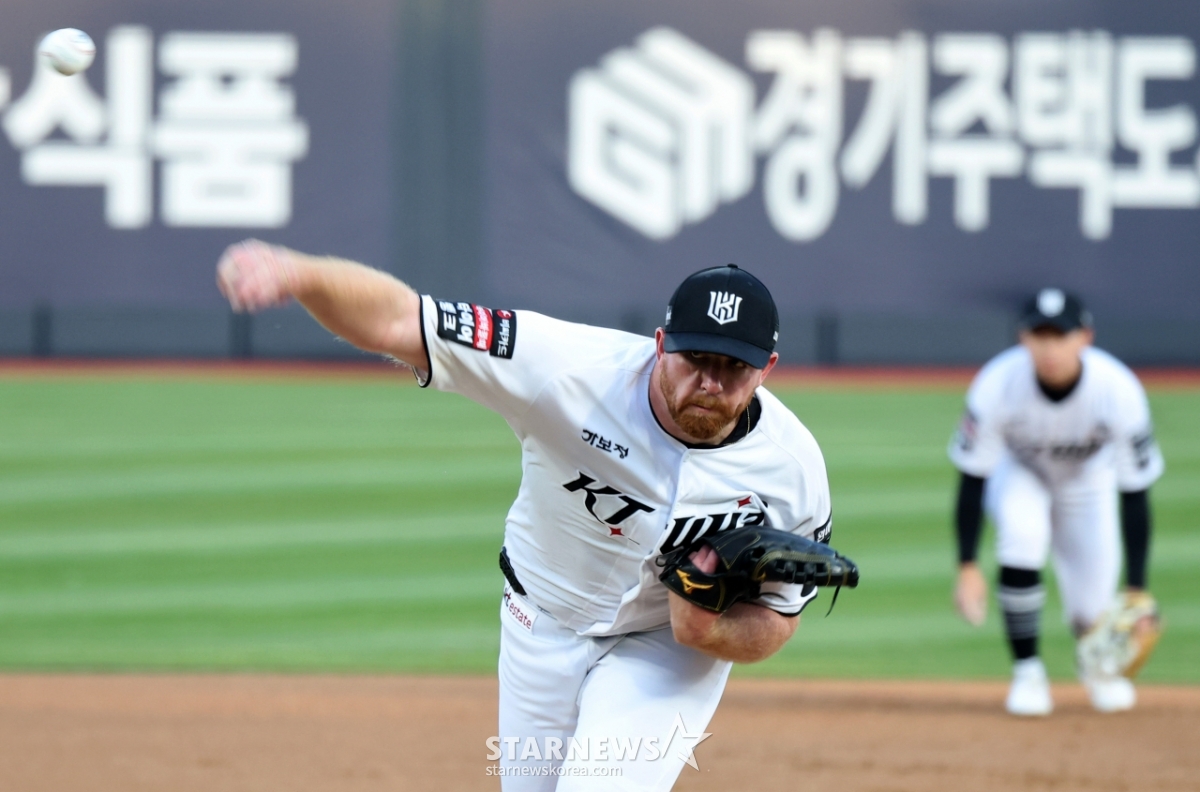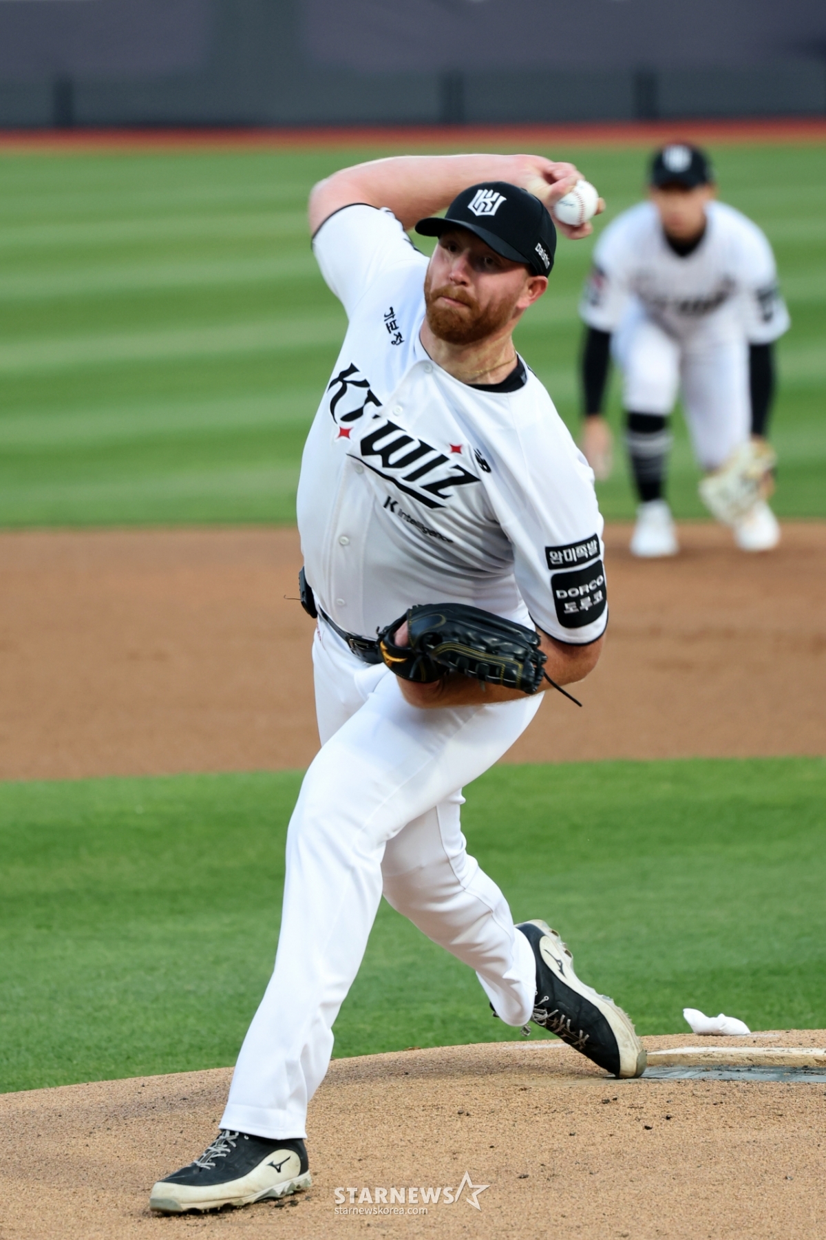 KT right-hander Sauer started on the 28th at Suwon KT Wiz Park in the 2026 KBO League match between LG Twins and KT Wiz, pitching effectively. LG started with Wells as their starting pitcher. 2026.04.28.