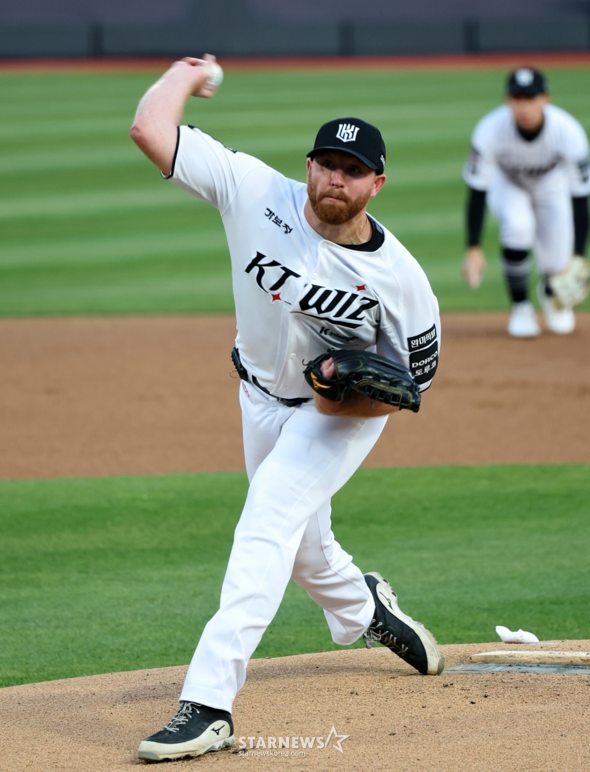 KT right-handed pitcher Sauer took the mound in the 2026 KBO League match between LG Twins and KT Wiz held at Suwon KT Wiz Park on the 28th. 2026.04.28.