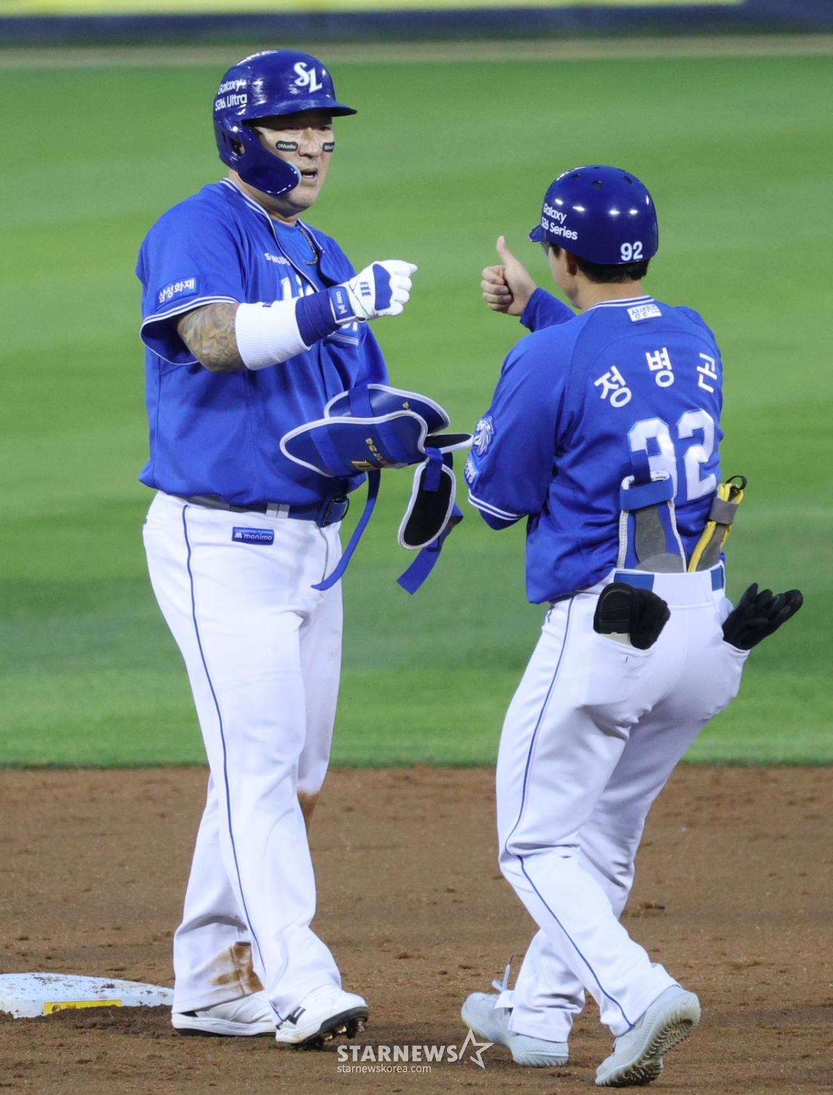 Samsung's Choi Hyung-woo hit a two-run home run over the fence in the bottom of the fourth inning with no outs and a runner on first base, reached base, and received a welcome from coach Jung Byung-gon.