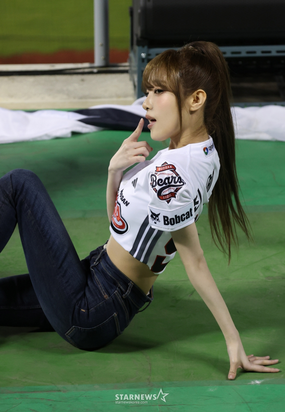 Singer Choi Ye-na (YENA) threw the ceremonial first pitch to wish the Doosan Bears a victory, then climbed onto the cheerleader stands during the cleaning break to deliver a stunning performance.