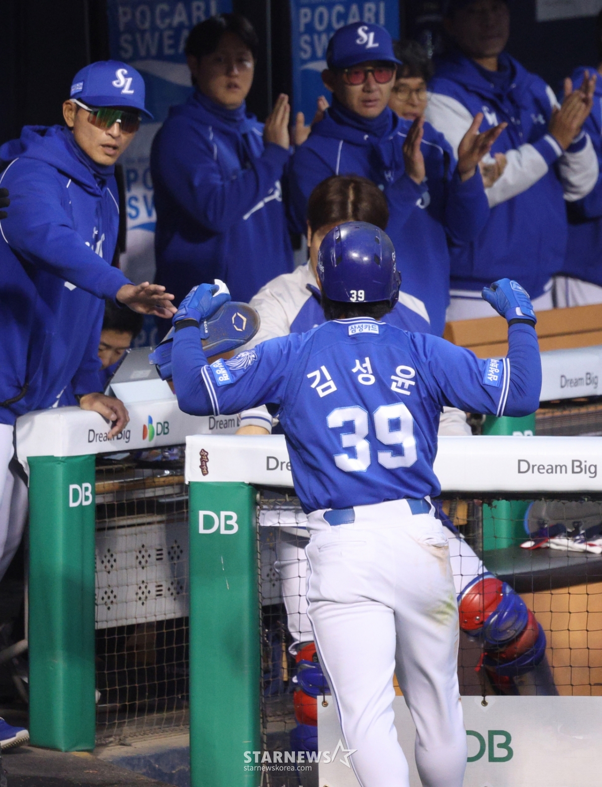 In the top of the fourth inning with no outs and runners on first and third, third baseman Kim Sung-yun scored the first run on Diaz's sacrifice fly and is being greeted by his teammates.