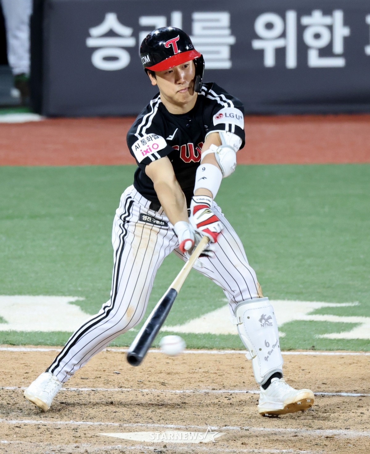 LG's Koo Bon-hyeok is shown throwing his bat to create a game-winning hit in the bottom of the 8th inning with two outs and runners on first and third base during the 2026KBO League match between LG Twins and KT Wiz at SuwonKT Wiz Park on the 30th. 2026.04.30