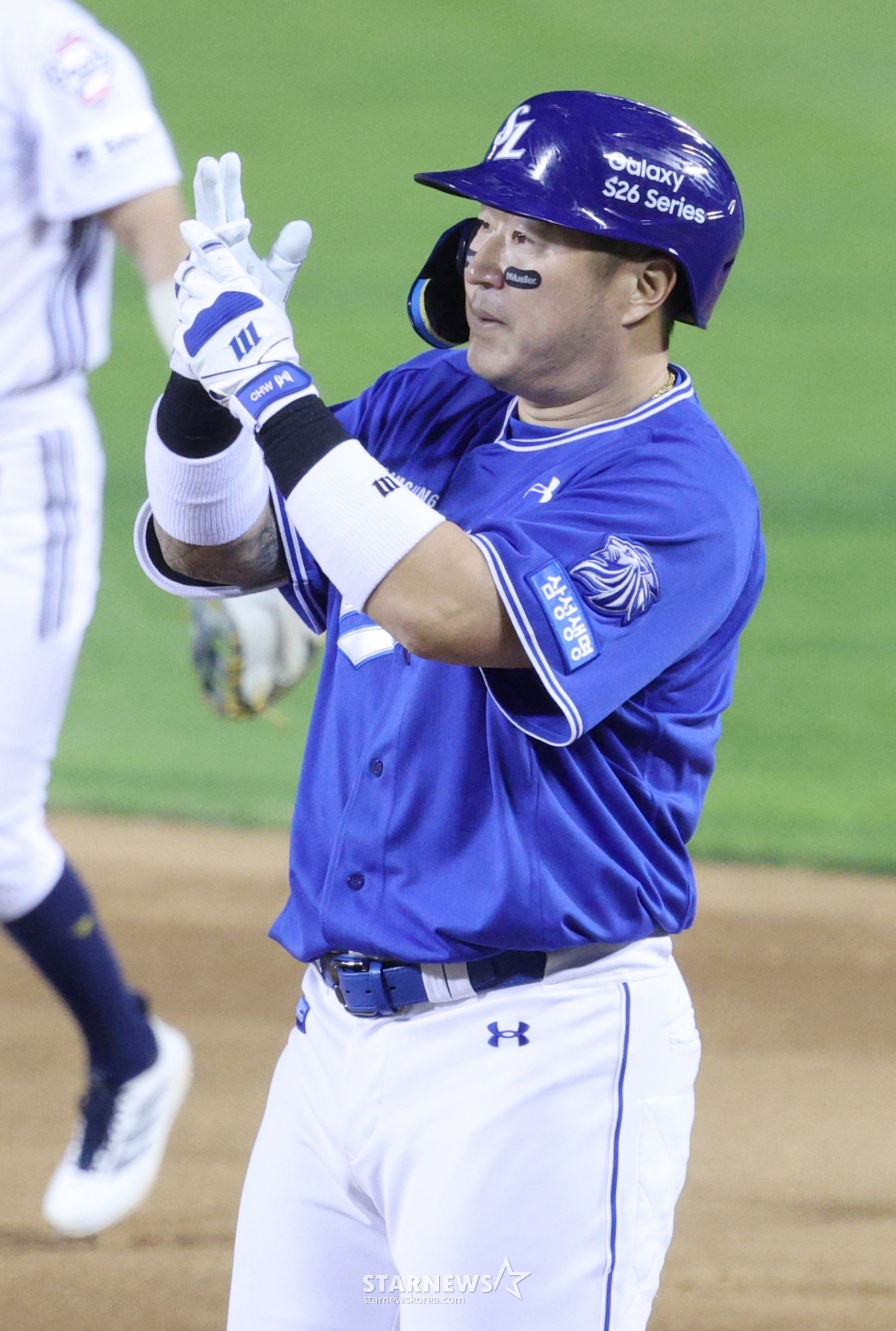 Samsung's Choi Hyung-woo is performing a ceremony after reaching base with a hit to right field in the bottom of the 8th inning with two outs.