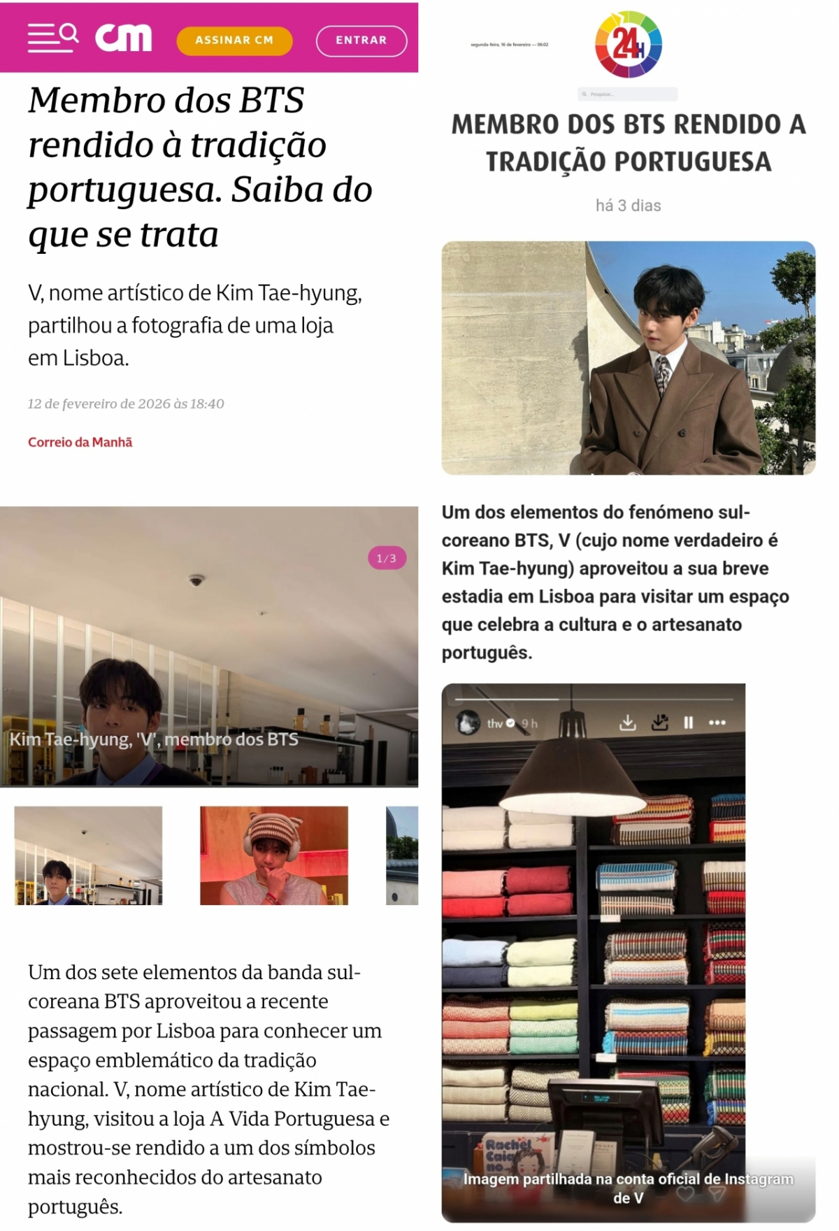 Portugal's largest circulation, daily newspaper Cmjornal (Correio da Manha ̃) and news platform 24HORAS, published articles saying "Vue fell in love with Portuguese tradition." Media outlets said V shared a photo of a Lisbon store on Instagram.