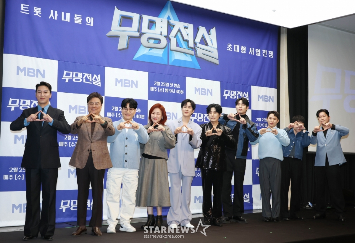 Jang Min-ho, Nam Jin, Jo Moon-jo, Joo Hyun-mi, Shin Yu, Kang Moon-kyung, Son Tae-jin, Yang Se-hyung, Lim Han-byeol, and Kim Dae-ho pose at the production presentation of the MBN audition "Unnamed Legend" held at Stanford Hotel in Sangam-dong, Mapo-gu, Seoul on the morning of the 25th. /2026.02.25