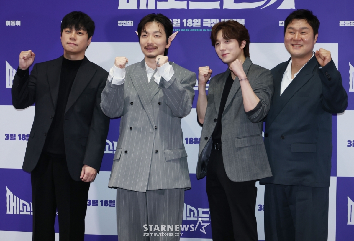 Director Lee Ki-hyuk, actors Lee Dong-hwi, Kang Chan-hee, and Yoon Kyung-ho pose at the press distribution preview and press conference of the movie "Method Acting" (director Lee Ki-hyuk) held at Megabox COEX in Gangnam-gu, Seoul on the afternoon of the 13th.