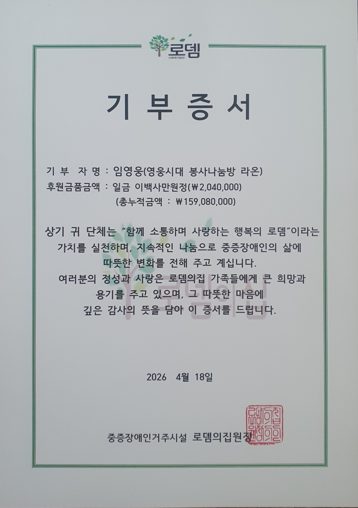 IM Young-woong's fan club "Yonghoonsidae Volunteer Sharing Room Raon" (hereinafter "Raon") visited Rhodome House, a facility for children with severe disabilities in Yangpyeong, Gyeonggi Province, on April 18, conducted their 58th meal service, and donated 2.04 million won.