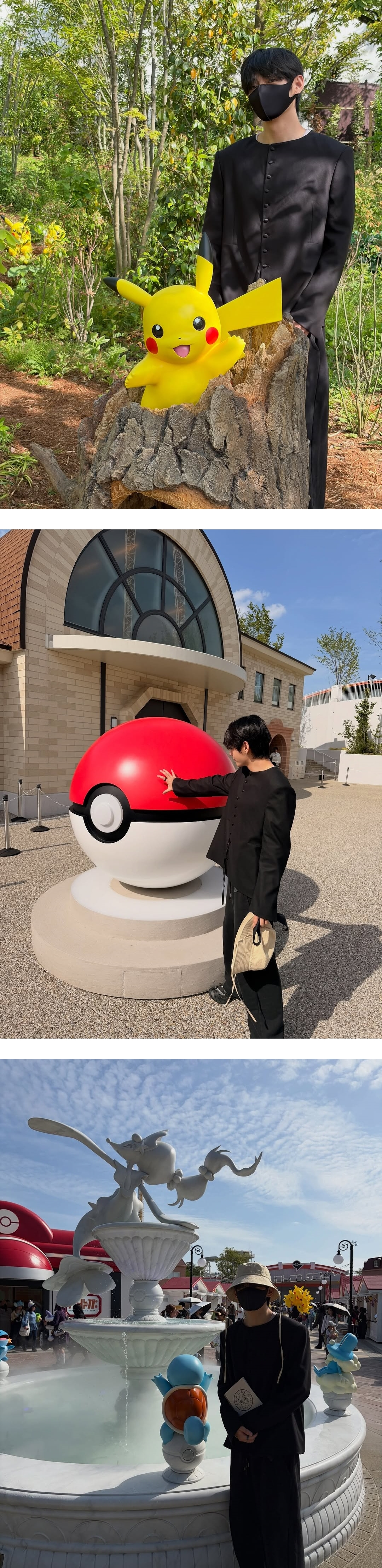 V is seen posing with various characters while wearing a Go Rafah hat featuring a Pokémon character. Although V, dressed in a black jacket, covered his face with a wide-brimmed hat and a mask, he could not hide his joy, occasionally removing the mask and hat to take photos in front of various Pokémon sculptures, including Pikachu and Jigglypuff.