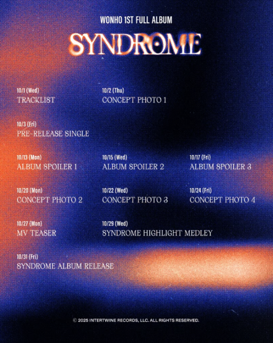 WONHO will further captivate fans with concept photos highlighting his matured visuals, to be released in four different versions. Additionally, three versions of an album spoiler will provide a vivid preview of the moods and themes captured in SYNDROME.