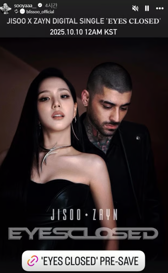 On October 6, Jisoo first sparked intrigue by posting a mysterious teaser image on social media. The photo showed a faint silhouette of a man behind her, the words “EYES CLOSED” boldly displayed across the image, and the caption “a duet is near,” hinting at an upcoming collaboration.
