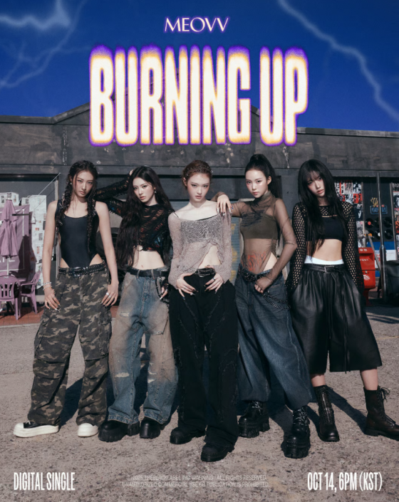 On October 13, THEBLACKLABEL released the second title poster for MEOVV’s upcoming digital single “BURNING UP,” which will drop on October 14, through the group’s official social media channels.
