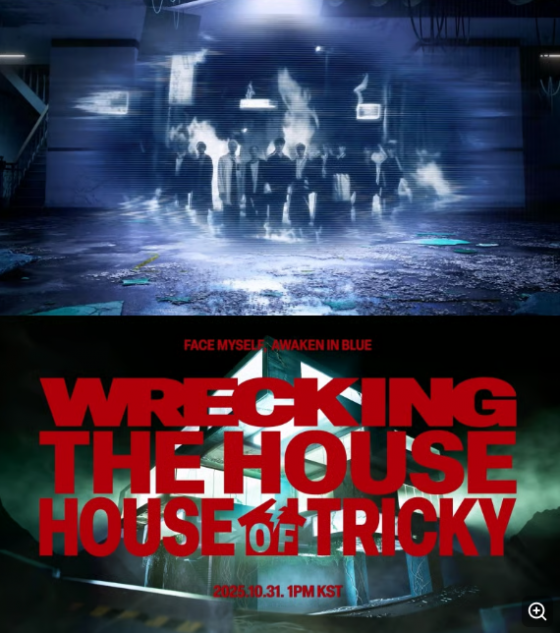 As the camera zooms out, the exterior of the “Tricky House” is revealed. When the door closes, cracks spread across the entire building, emitting a mysterious blue light. The cinematic visuals and grand sound design make the teaser feel like a fantasy movie, keeping viewers glued to the screen. The clip ends with the bold phrases “FACE MYSELF, AWAKEN IN BLUE”, along with the album title ‘HOUSE OF TRICKY: WRECKING THE HOUSE’ and the release date ‘2025.10.31 | 1PM (KST)’, igniting excitement among global fans awaiting xikers’ return.