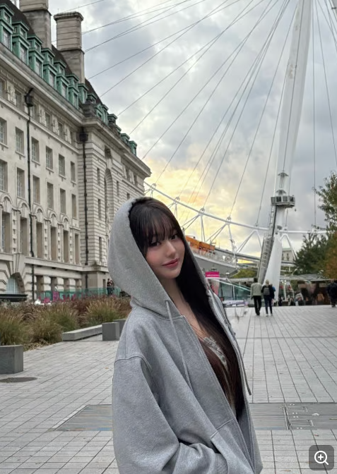 In the released photos, Jang Wonyoung is seen wearing a gray hoodie, gazing into the camera on a street in London. Posing in front of a clock tower, she turns even ordinary moments into a pictorial scene.