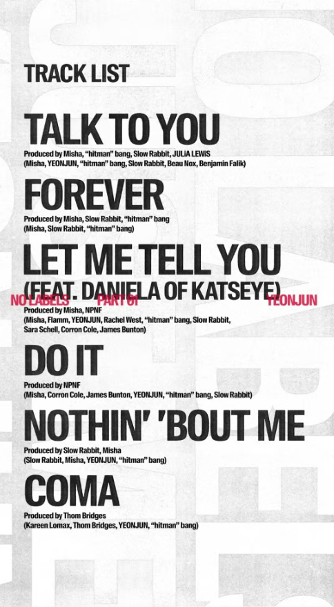 At midnight on October 21 (KST), the group’s official social media channels revealed the tracklist for Yeonjun’s first mini album, “NO LABELS: PART 01.” The album includes six tracks in total — “Talk to You” (title track), “Forever,” “Let Me Tell You (feat. Daniela of KATSEYE),” “Do It,” “Nothin’ Bout Me,” and “Coma.”