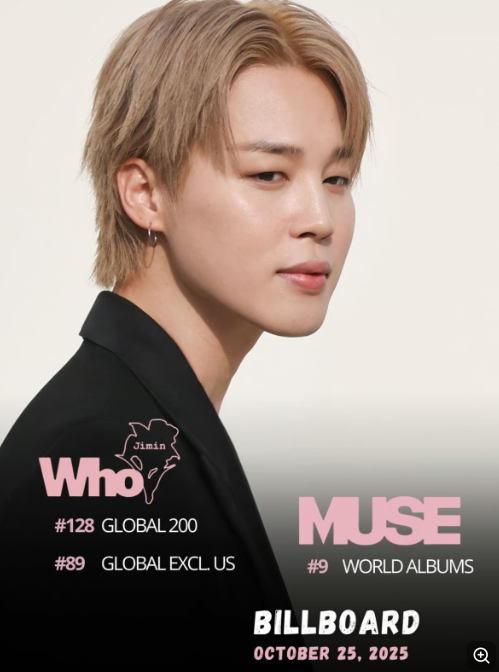 According to American music magazine Billboard, Jimin’s song “Who” climbed seven spots to No. 128 on the Billboard Global 200 and jumped nine spots to No. 89 on the Global (Excl. U.S.) chart for the week of October 25, marking a notable rebound.