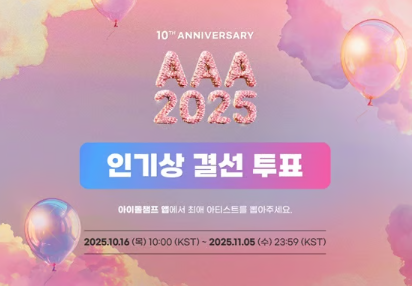 The final round of voting for the 10th Asia Artist Awards 2025 (AAA 2025) began on October 16 and will close at midnight on November 5. The popularity voting, celebrating the awards’ 10th anniversary, is being conducted through the mobile idol fandom application Idol Champ, jointly operated by MBC PLUS and mobile advertising platform company TNK Factory.