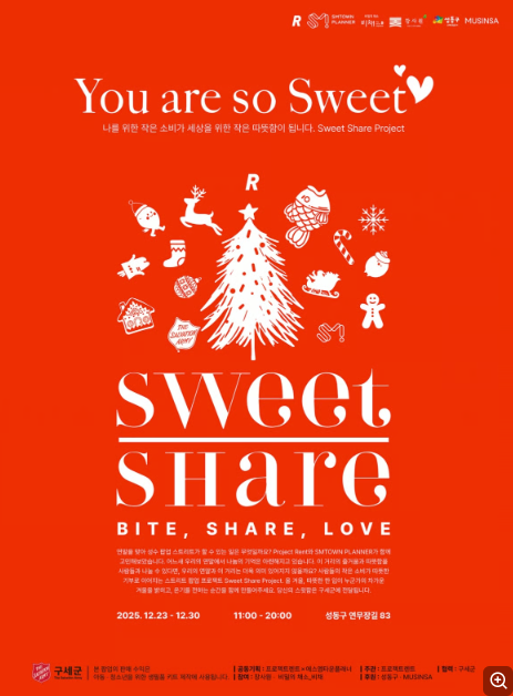 Sweet Share is a project jointly planned by SM Town Planner and Project Rent to highlight the value of small acts of sharing along Seongsu-dong’s pop-up street. The initiative is supported by the Seongdong District Office and Musinsa, and operated by Changsa-won and Bichae. Through various pop-up programs—including My Seed Planting, Refresh Lab, and a winter snack corner—all proceeds will be donated to the Salvation Army to produce daily-living kits for children and teenagers, adding further significance to the campaign.