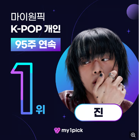 BTS’s Jin has once again demonstrated his formidable influence by ranking No. 1 for 95 consecutive weeks in the MY1PICK K-pop individual weekly ranking.