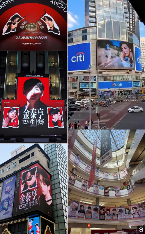 The fan club also organized themed album stores and various events across nine cities: Hangzhou, Guangzhou, Chongqing, Chengdu, Shenzhen, Wuhan, Nanchang, Nanjing, and Xi’an. Birthday celebration videos for V were broadcast on a large screen at Century Square on Nanjing Road East—often called the “Myeongdong of Shanghai”—as well as on a major screen on Pozi Street in Changsha. In Shenzhen, a birthday video was displayed on a massive 118-meter super-sized billboard, impressing viewers with its overwhelming scale.
