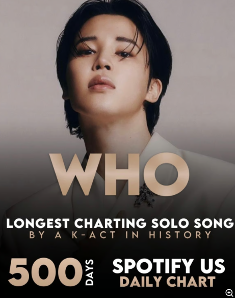 Jimin’s solo track “Who,” the title song from his second solo album MUSE, ranked No. 46 on the Spotify U.S. Daily Top Songs Chart dated December 28, marking 500 days on the chart. “Who” is the first and only K-pop solo song to achieve this milestone. The song also holds the record as the first and only K-pop solo track to reach No. 1 on the Spotify U.S. Daily Top Songs Chart without any collaboration with international artists, and it is now the only K-pop solo song to have remained on the chart for 500 days.