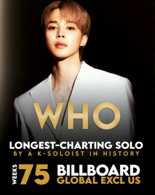 With “WHO,” Jimin has set another milestone by becoming the first and only K-pop artist to keep a song on the Spotify U.S. chart for 500 days, as of December 28 last year.