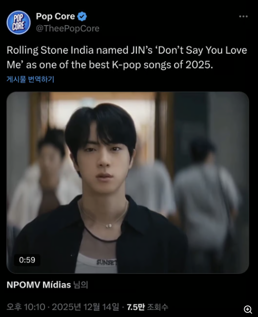 The song also received international acclaim at the BreakTudo Awards 2025, held on November 18 (local time) in São Paulo, Brazil, where it won the International Hit of the Year award. Through this honor, Jin further solidified his presence on the global stage.
