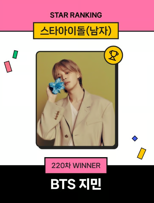 In the 220th Star Ranking Star Idol Male poll, which ran from 3:01 p.m. on the 8th to 3:00 p.m. on the 15th, Jimin took first place, surpassing 2PM’s Junho and BTS’s Jin. In this round of voting, Jimin received 83,624 votes. Junho ranked second with 46,296 votes, followed by Jin in third place with 28,363 votes.