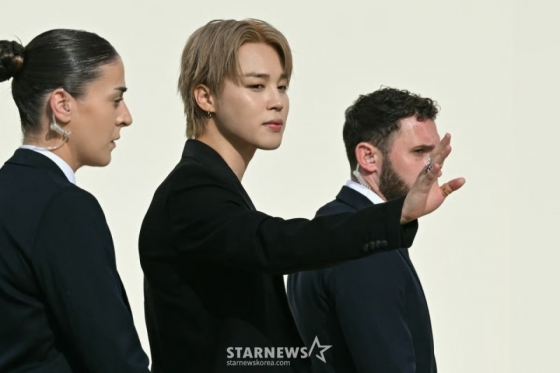 当時、ジミンはブラックのジャケットにレザーパンツを合わせた洗練されたスタイルで登場し、優雅で高級な雰囲気と余裕のある微笑で現場を圧倒し、現地フォトグラファーたちのフラッシュ洗礼が降り注ぎ、イベント会場周辺は彼の名前を連呼する歓声でいっぱいだった。