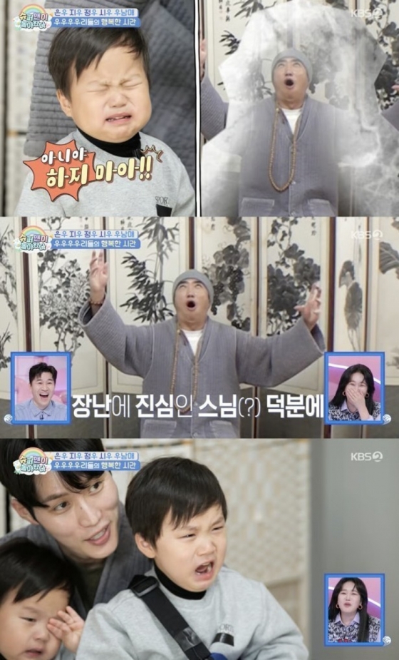 昨年はサンタクロース姿で登場したキム・ジョンミンは、今回は僧侶の扮装で現れ、再び笑いを誘った。一方、チャン・ドンミンが「目を閉じると石になる」と冗談を言うと、真に受けたウヌは弟ジョンウが石になるのではと心配して涙を流した。そんな兄を見たジョンウは、代わりにチャン・ドンミンへ「冗談はやめて」と伝え、兄弟愛をのぞかせた。その後、チャン・ドンミンが石になったふりをすると、二人は驚いて大泣きし、切なさと可愛らしさを同時に感じさせた。
