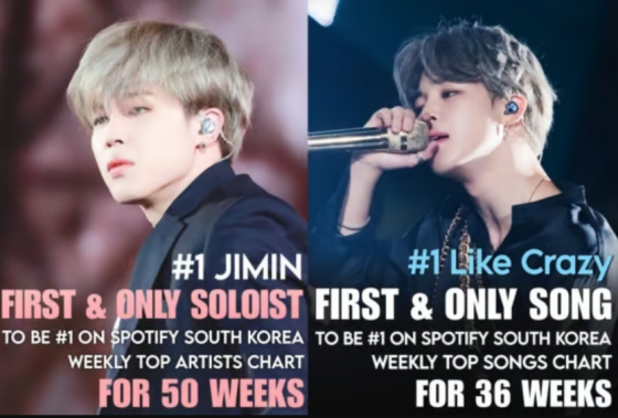 此外,在6月21日发表的韩国Spotify每周Top Song排行榜(6月14日~6月20日)中,连续36周位居榜首,创造了连续36周占据榜首的首个也是唯一一首歌曲的记录,《Like Crazy》刷新了Spotify韩国Top Song排行榜每日和每周最多1位歌曲的记录,持续着长期人气。