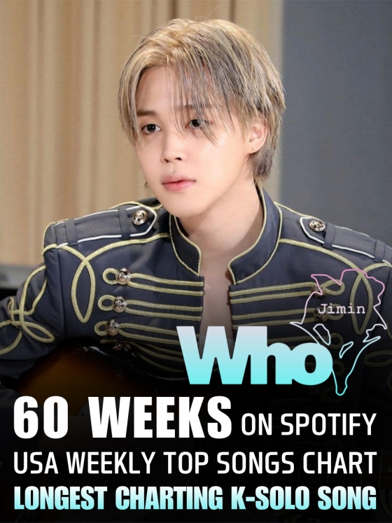 JIMIN的第二张个人专辑《MUSE》的主打曲《Who》在9月19日至9月25日当周登上全球最大的音乐流媒体平台Spotify“美国Weekly Top Song”第42位,连续第60周进入榜单,创下K-pop个人单曲最长在榜新纪录。