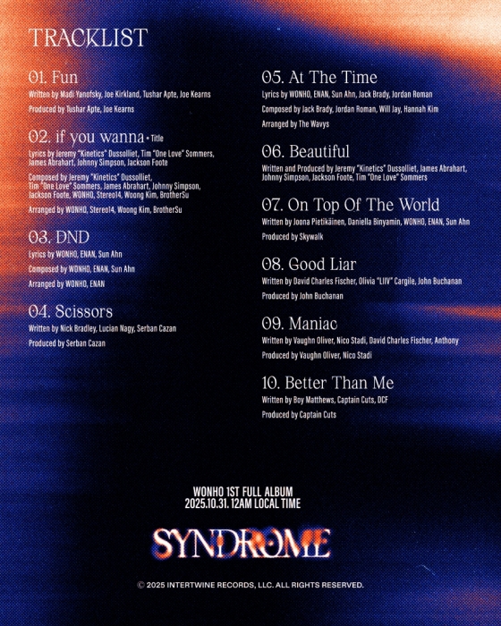 所属公司Hylaine Entertainment于1日傍晚8点通过官方SNS平台公开了WONHO首张正规专辑《Syndrome》的曲目列表。